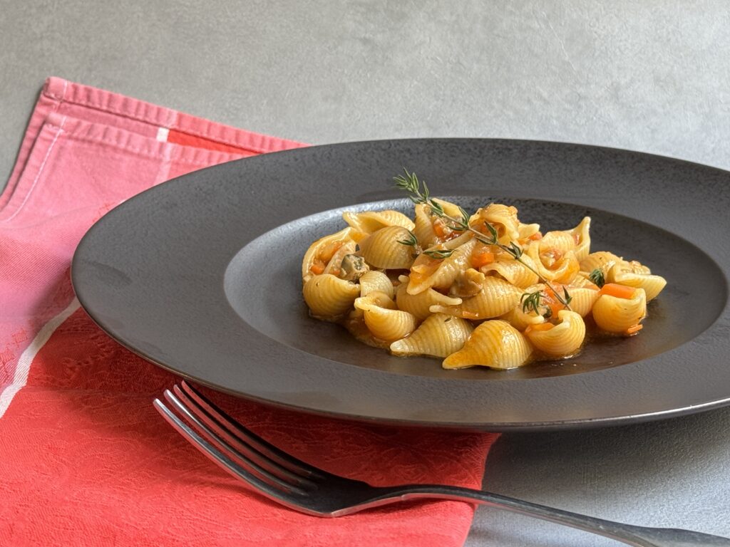 牡蠣の旨みを凝縮したラグーソースを、貝殻型のショートパスタ・コンキリエに絡めて。